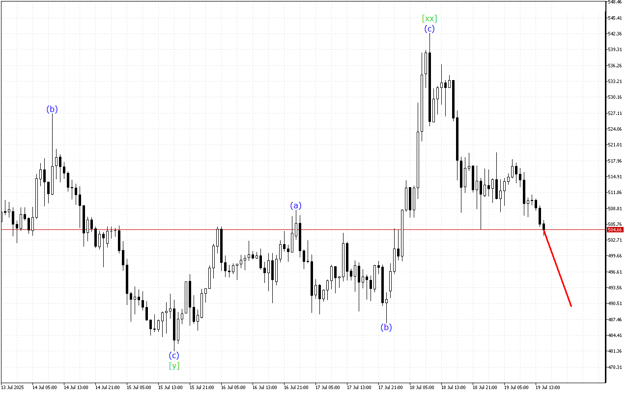 Daha yüksək zaman çərçivəsində üçlü üç dalğa strukturunun inkişafı var. Hazırda [xx] dalğası formalaşıb. Bundan sonra qiymət aşağıya doğru hərəkətini davam etdirməlidir.