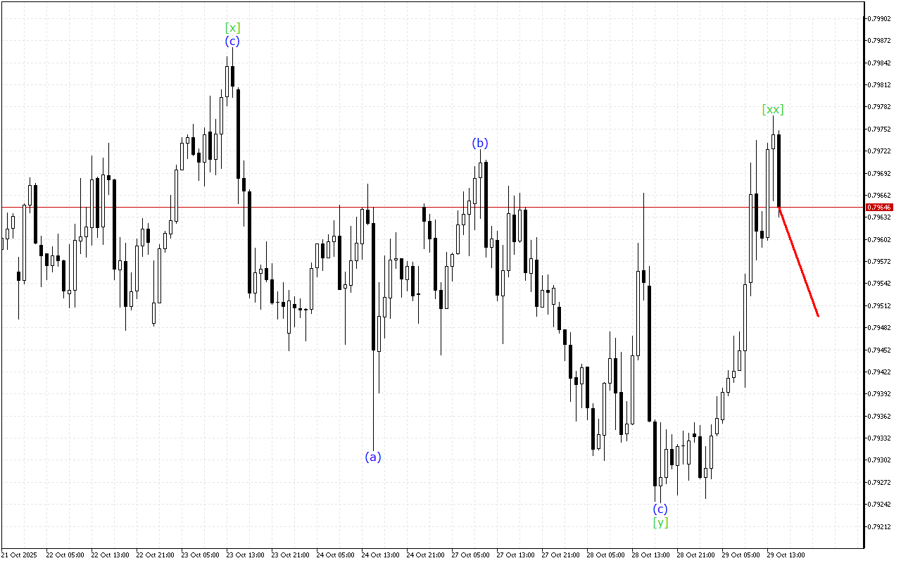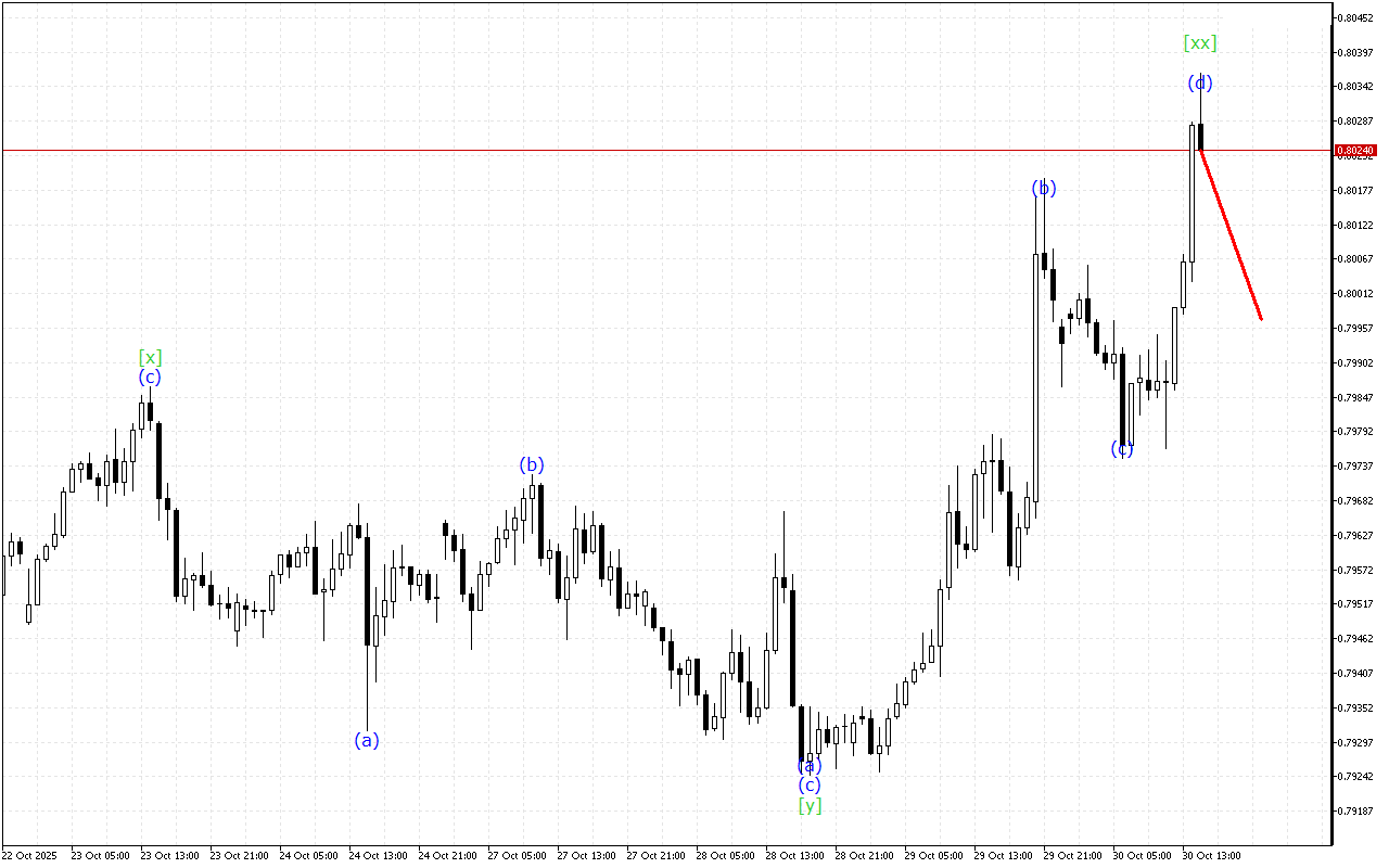낮은 차수의 파동은 하향 ABC 지그재그의 형성을 나타냅니다. 파동 (c)는 이미 완료되었으므로 새로운 파동 구조의 형성을 예상할 수 있습니다.