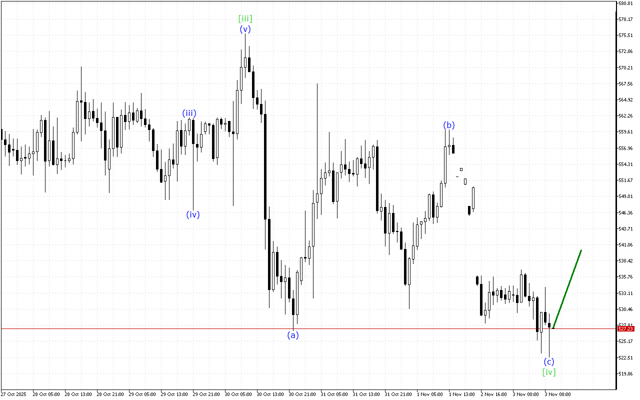 더 높은 간격으로 조정파 [iv]가 계속 형성됩니다. 완료되면 시장은 다시 상승할 것입니다. 이 움직임의 일부로 로컬 최대값이 업데이트되면서 파동 [v]가 형성되는 것을 볼 수 있습니다.