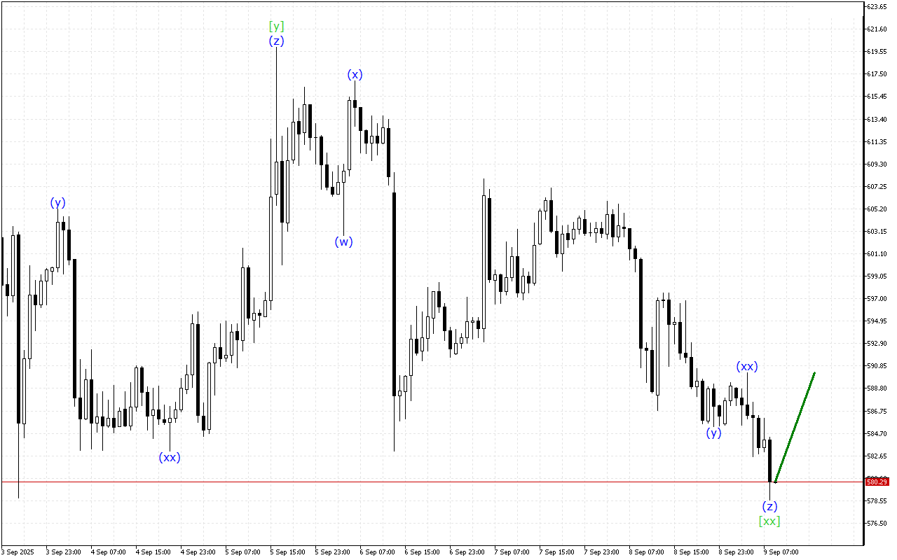더 작은 시간 척도에 따르면, 시장은 ABC 지그재그 내에서 움직입니다. 현재 가격은 파동(c)의 형성을 완료하고 있으며 가격 움직임은 새로운 파동 형성으로 이동할 수 있습니다.