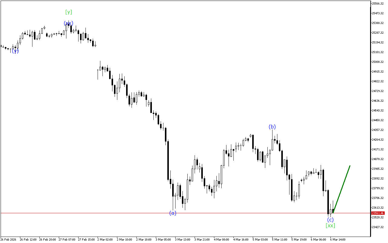 Το DAX 40 συνεχίζει να κινείται εντός της κυματικής δομής Triple Three. Τώρα, προφανώς, ο σχηματισμός του κύματος [xx] έχει ολοκληρωθεί στο γράφημα και η ανάπτυξη μιας ανοδικής κίνησης μπορεί να αναμένεται με το κύμα [z].