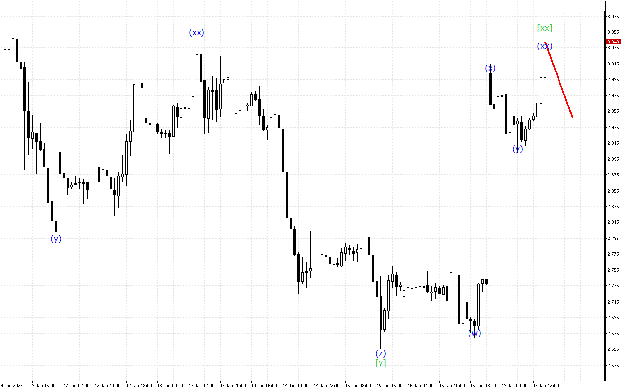 Η ανάλυση της κυματικής δομής υψηλότερου βαθμού δείχνει μια σφήνα που πέφτει. Μέσα σε αυτόν τον σχηματισμό πέντε κυμάτων, ολοκληρώνεται ο σχηματισμός του κύματος [iv] και αναμένεται η επανάληψη της καθοδικής κίνησης εντός του κύματος [v].
