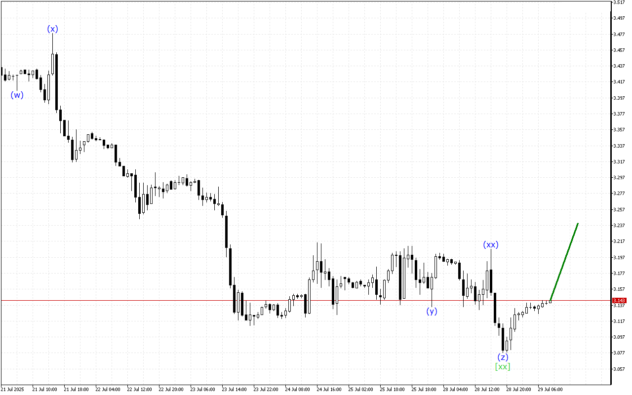 Το μεσοπρόθεσμο διάνυσμα κίνησης του Natural Gas υποδηλώνει το σχηματισμό μιας δομής κυμάτων τριπλών τριαριών. Τώρα ο σχηματισμός του κύματος [xx] έχει ολοκληρωθεί και αναμένεται η έναρξη μιας ανοδικής κίνησης εντός του κύματος [z].