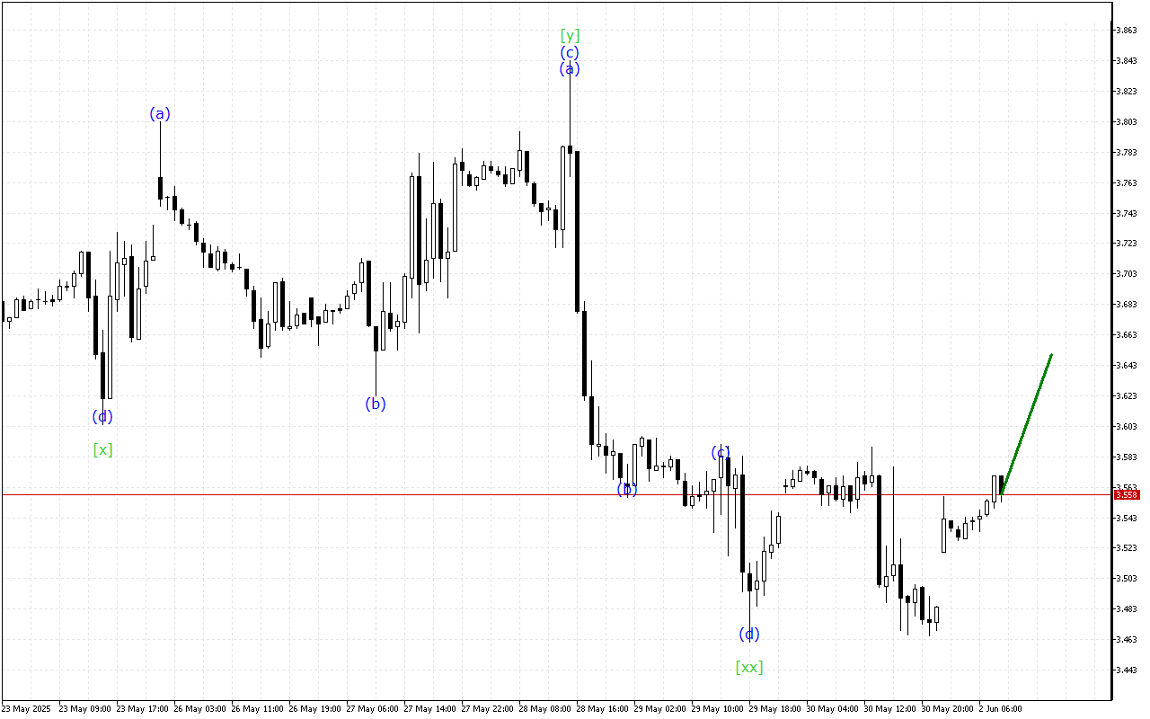 Η ανάλυση της κυματικής δομής υψηλότερου βαθμού δείχνει μια σφήνα που πέφτει. Μέσα σε αυτόν τον σχηματισμό πέντε κυμάτων, ολοκληρώνεται ο σχηματισμός του κύματος [iv] και αναμένεται η επανάληψη της καθοδικής κίνησης εντός του κύματος [v].
