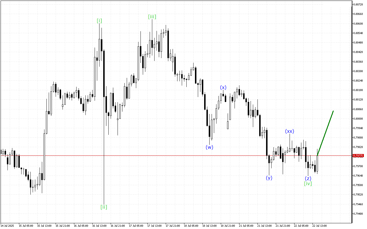 There is the development of a triple three wave structure on a higher time-frame. Currently, the wave [xx] has been formed. After this the price should resume its downward movement.