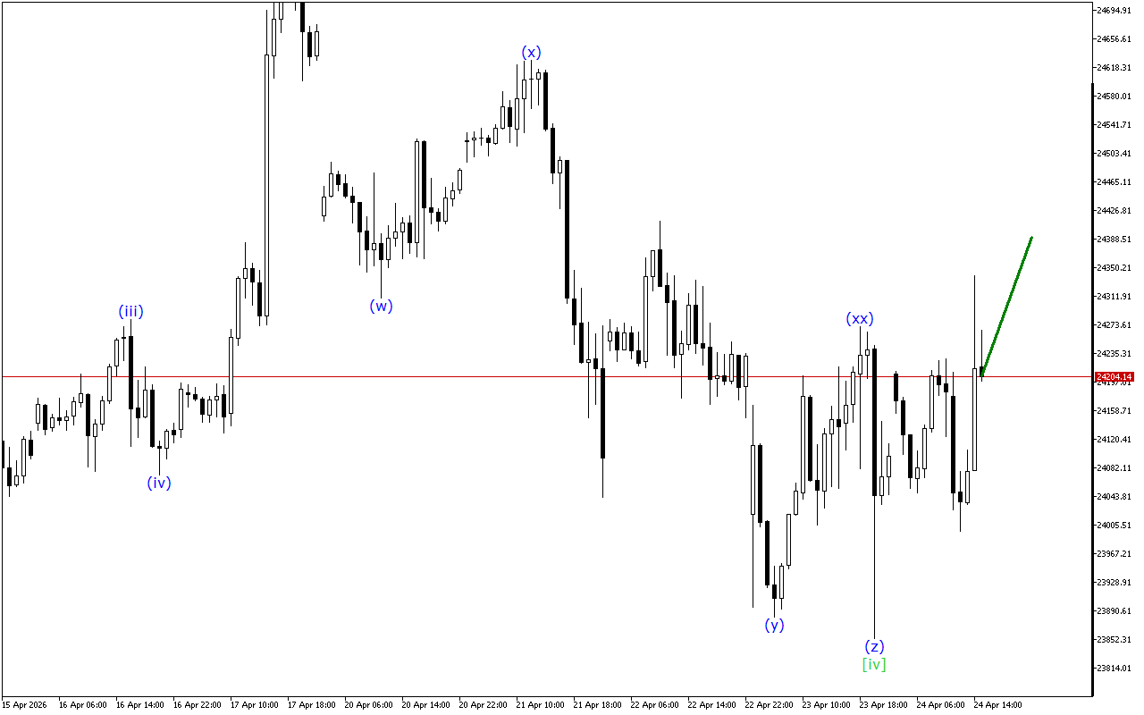 At a higher time interval, an ascending wedge continues to form. A downward corrective wave [iv] has been formed in this movement by this moment. Once this wave is completed, the formation of an upward wave [v] should be seen.
