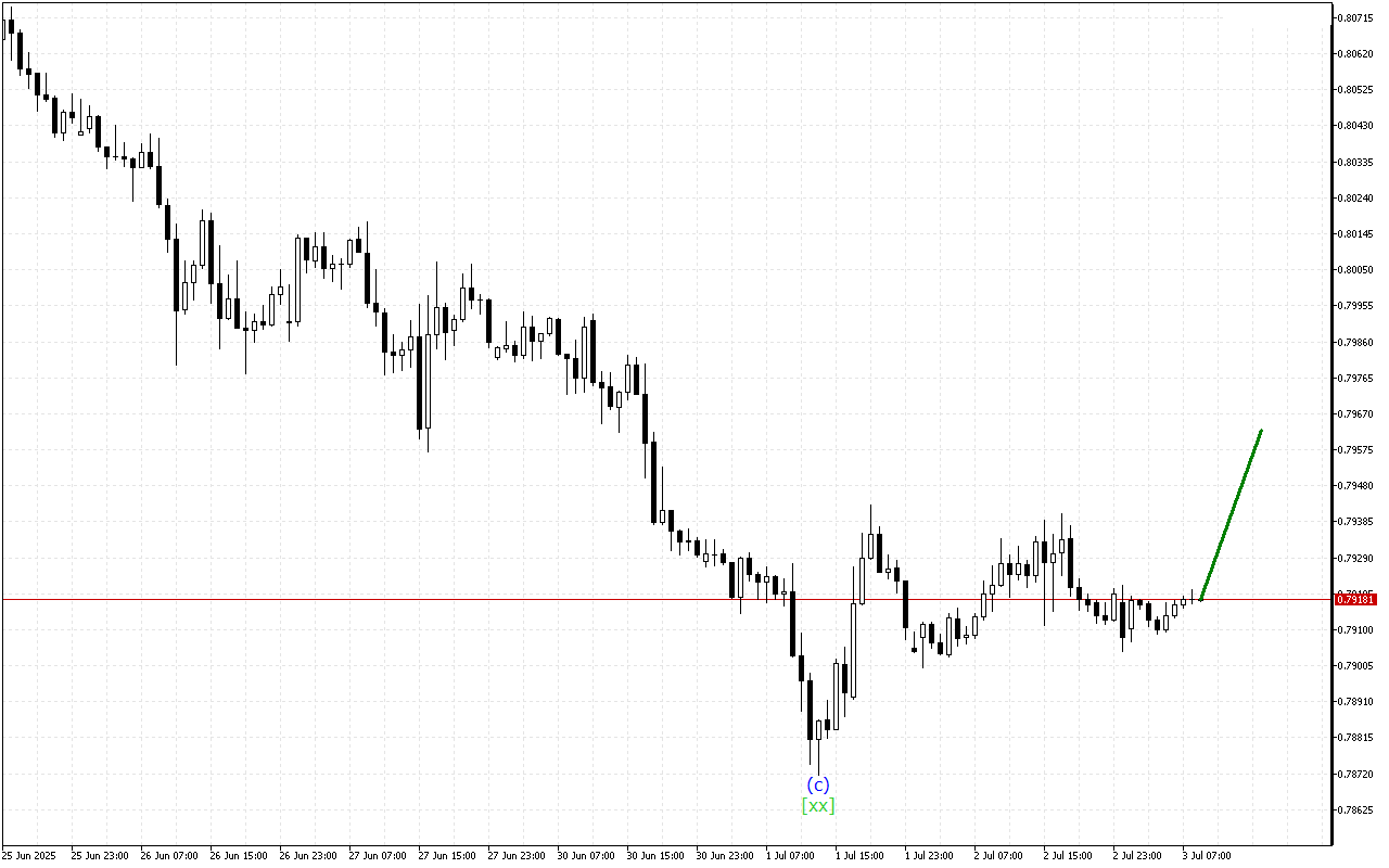 Lower-degree waves indicate the formation of a downward ABC zigzag. The wave (c) must have already been completed, so the formation of a new wave structure can be expected.