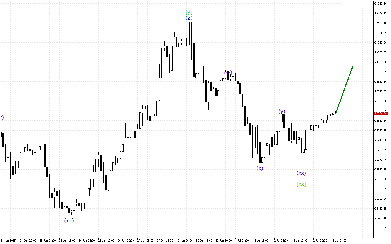 DAX 40 აგრძელებს მოძრაობას სამმაგი სამი ტალღის სტრუქტურის ფარგლებში. ახლა, როგორც ჩანს, გრაფიკზე [xx] ტალღის ფორმირება დასრულდა და აღმავალი მოძრაობის განვითარება შეიძლება მოსალოდნელი იყოს [z] ტალღით.