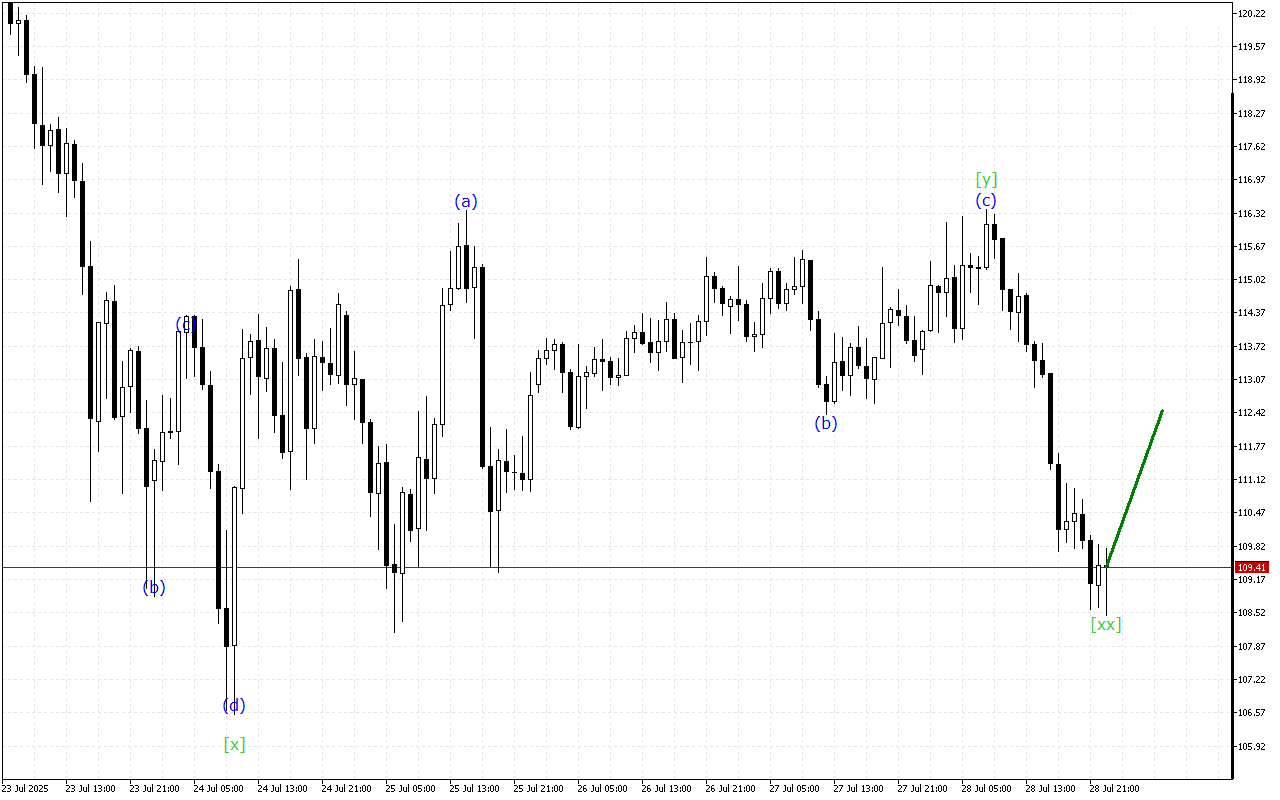 ქვედა ხარისხის ტალღის სტრუქტურაში აღინიშნება სამმაგი სამის ფორმირება. ახლა ფასი არის ტალღაში (z), რომელიც ასრულებს ამ ფორმირებას. ეს ტალღა უახლოეს მომავალში დასრულდება. ამის შემდეგ, ფასების მიმდინარე ტენდენცია შეიძლება შეიცვალოს.