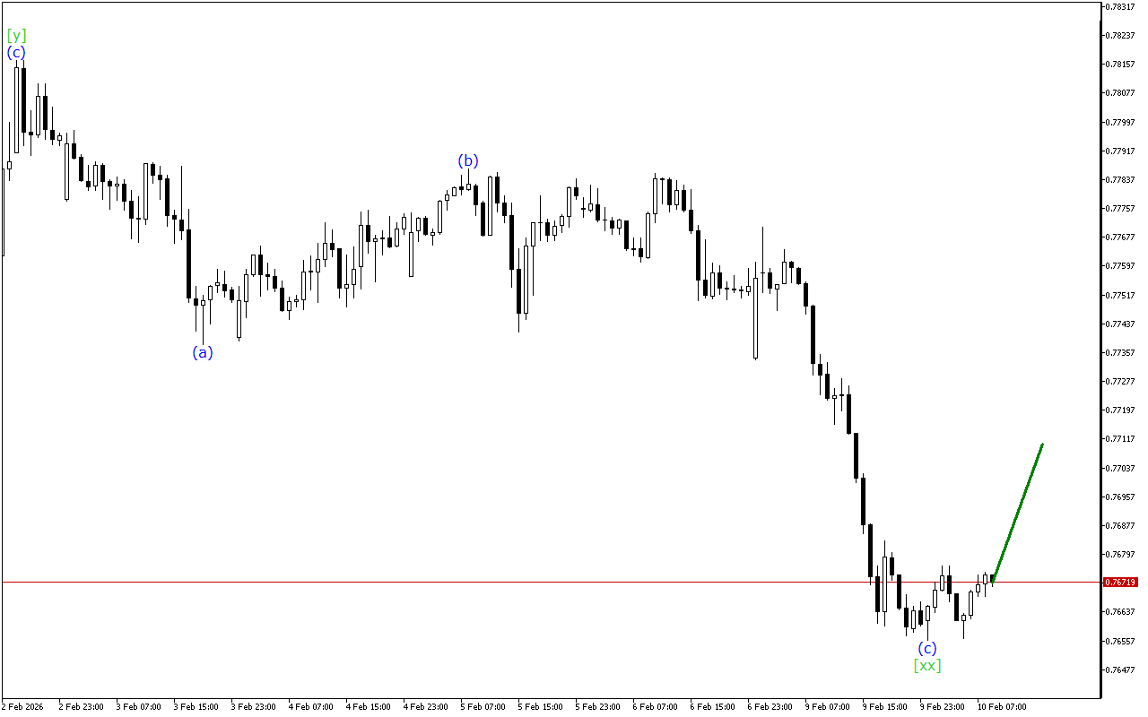 USDCHF-ის საშუალოვადიანი მოძრაობის ვექტორი მიუთითებს სამმაგი სამი ტალღოვანი სტრუქტურის ფორმირებაზე. ახლა ტალღის [xx] ფორმირება დასრულებულია და მოსალოდნელია აღმავალი მოძრაობის დაწყება [z] ტალღაში.