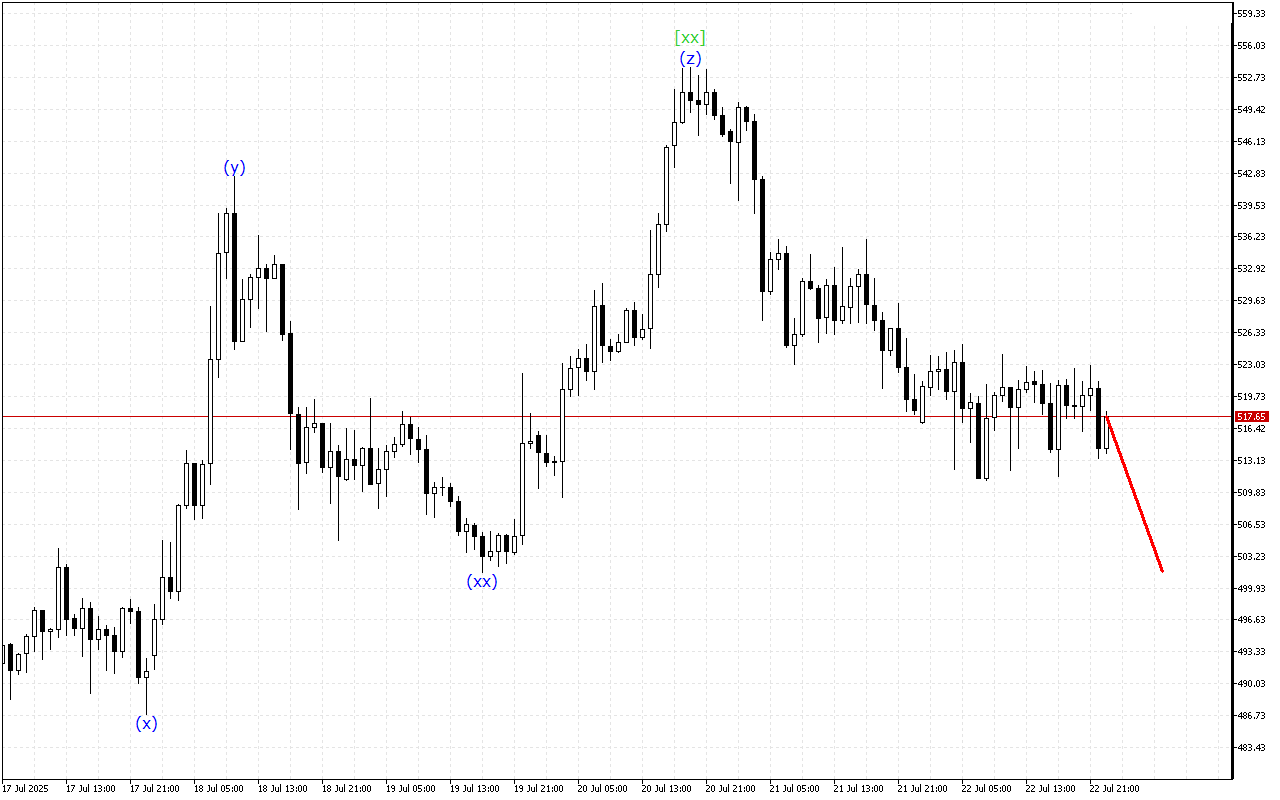 DAX 40 орташа мерзімді қозғалыс векторы толқын құрылымының қалыптасуын көрсетеді. Енді [xx] толқынының қалыптасуы аяқталды және [z] толқынының ішінде жоғары қарай қозғалыстың басталуы күтілуде.