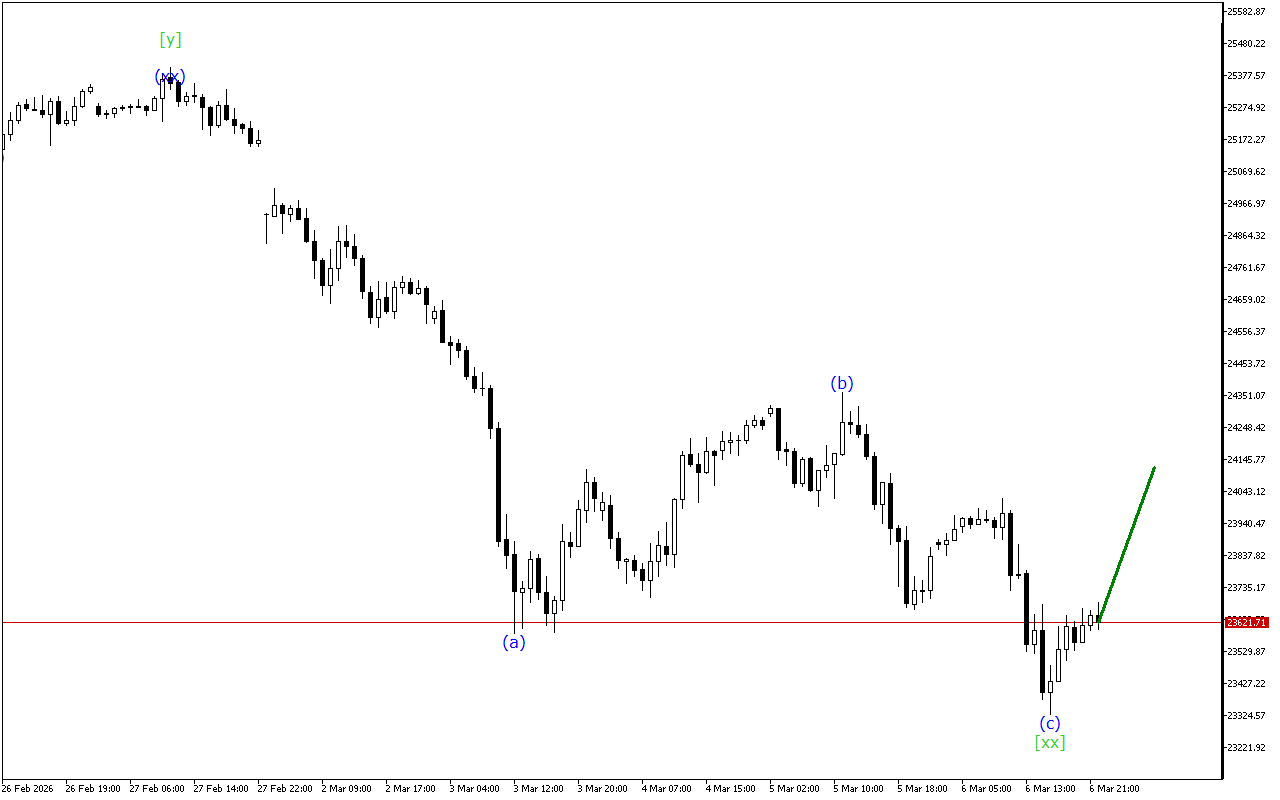 Қорытындылай келе, қазіргі уақытта DAX 40 графикада төмендеу қозғалыс векторын сақтауда. Дегенмен, түзету толқыны қалыптасудың соңғы сатысында.