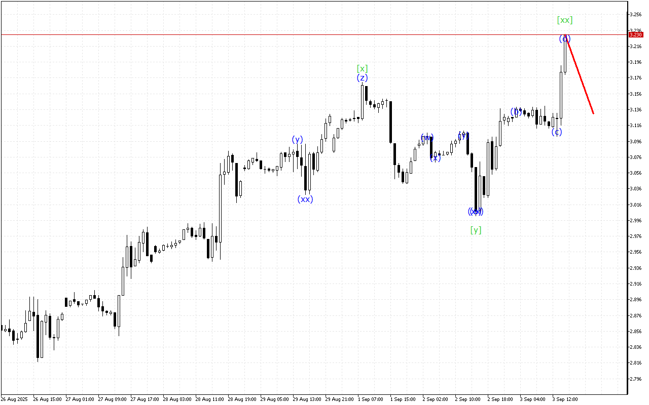Төменгі дәрежелі толқындық құрылымда үшеулік үштіктің пайда болуы байқалады. Қазір баға (z) толқынында осы формацияны аяқтайтын. Бұл толқын жақын арада аяқталады деп күтілуде. Осыдан кейін ағымдағы баға үрдісі өзгеруі мүмкін.