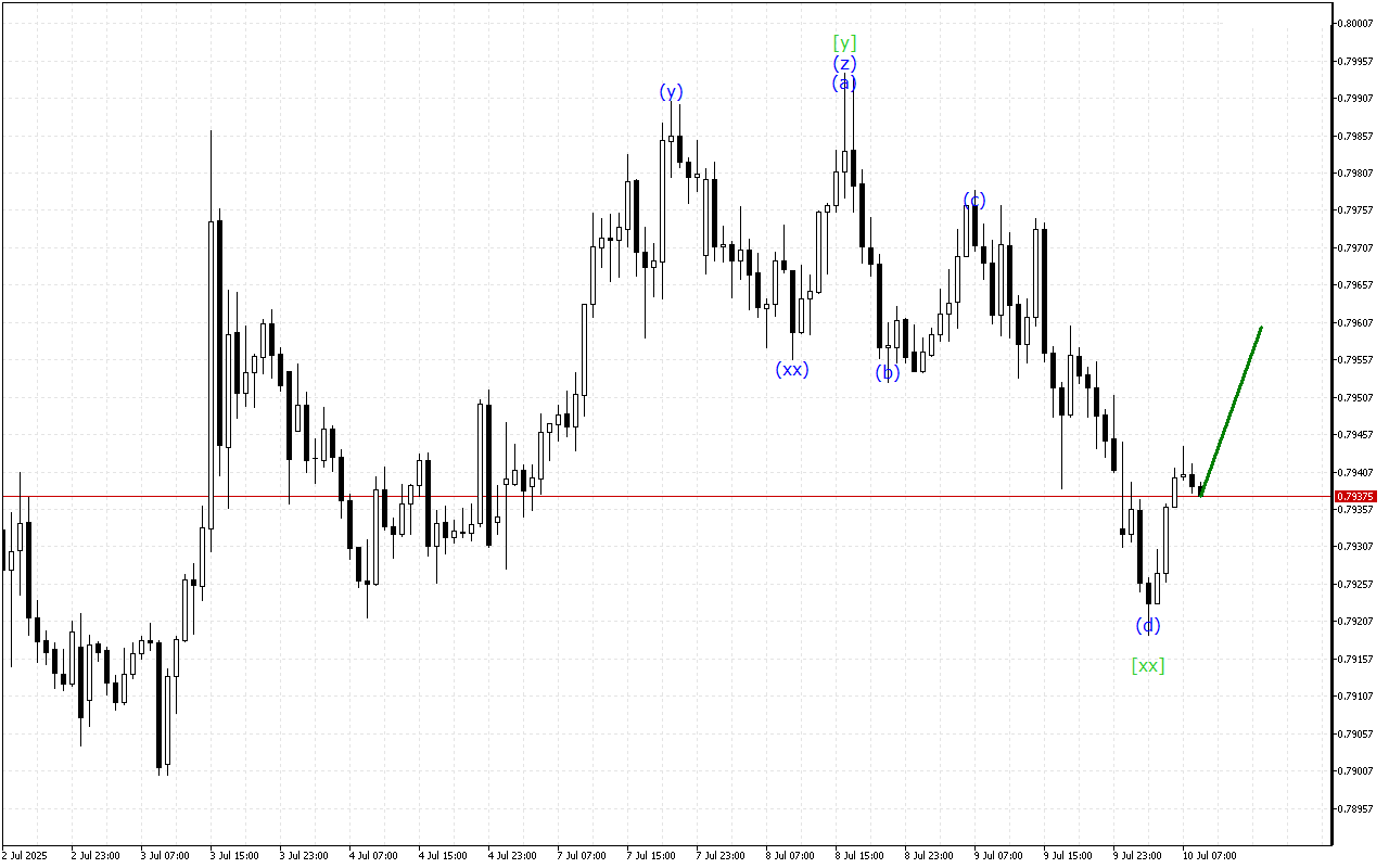 USDCHF орташа мерзімді қозғалыс векторы толқын құрылымының қалыптасуын көрсетеді. Енді [xx] толқынының қалыптасуы аяқталды және [z] толқынының ішінде жоғары қарай қозғалыстың басталуы күтілуде.