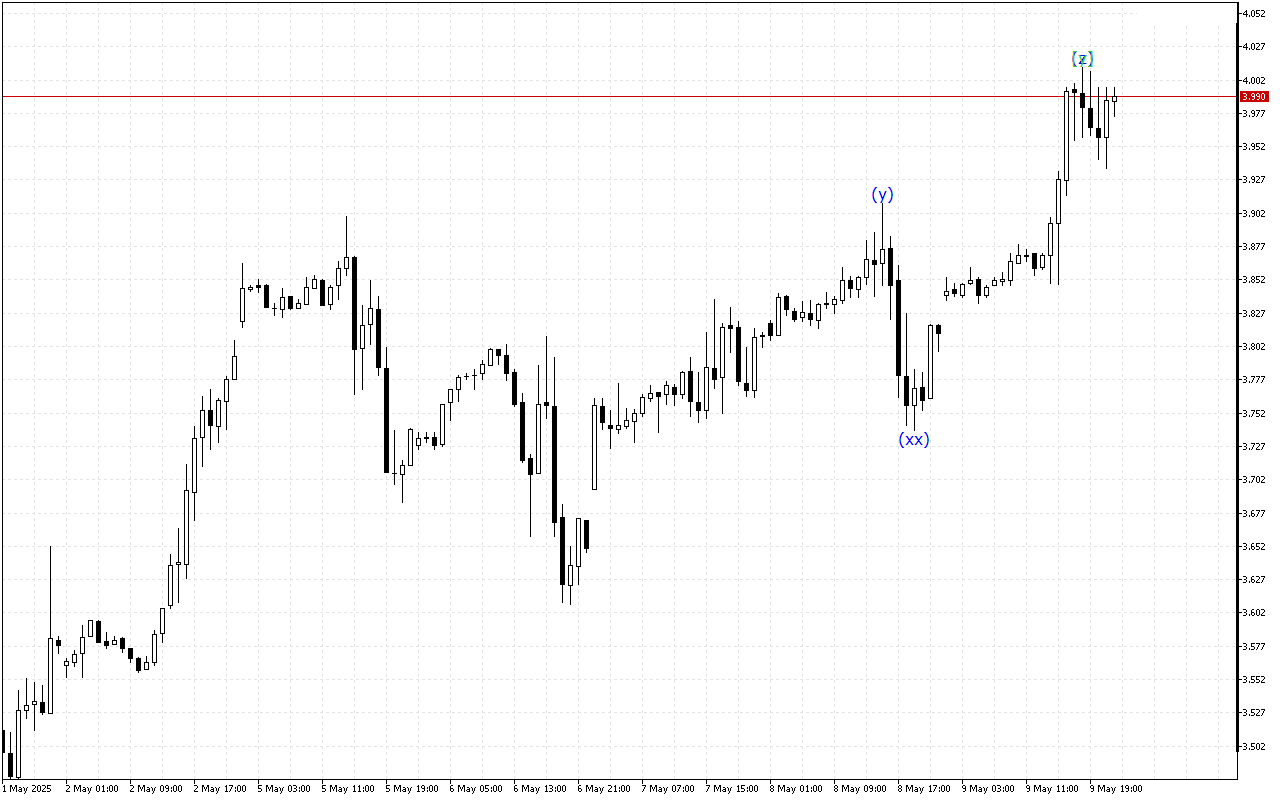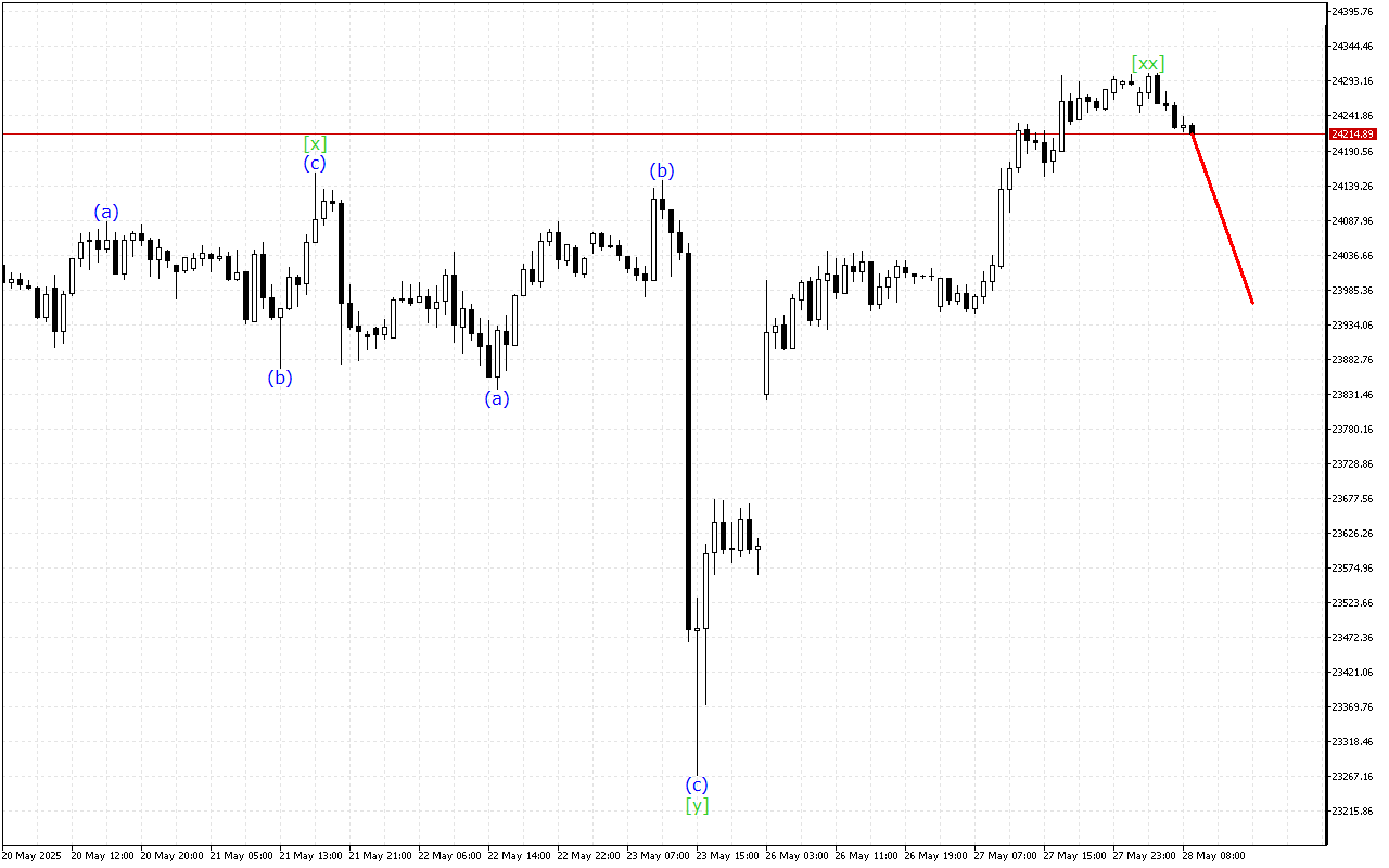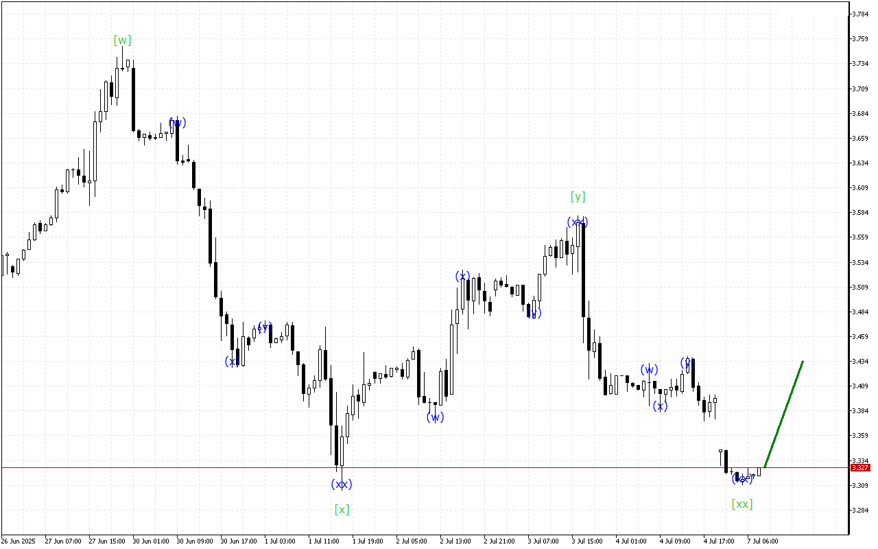 Жоғары дәрежелі толқын құрылымын талдау құлау сынасын көрсетеді. Осы бес толқынды формацияның шеңберінде [iv] толқынның қалыптасуы аяқталады және [v] толқынның ішінде төмен қарай қозғалыстың қайта басталуы күтілуде.