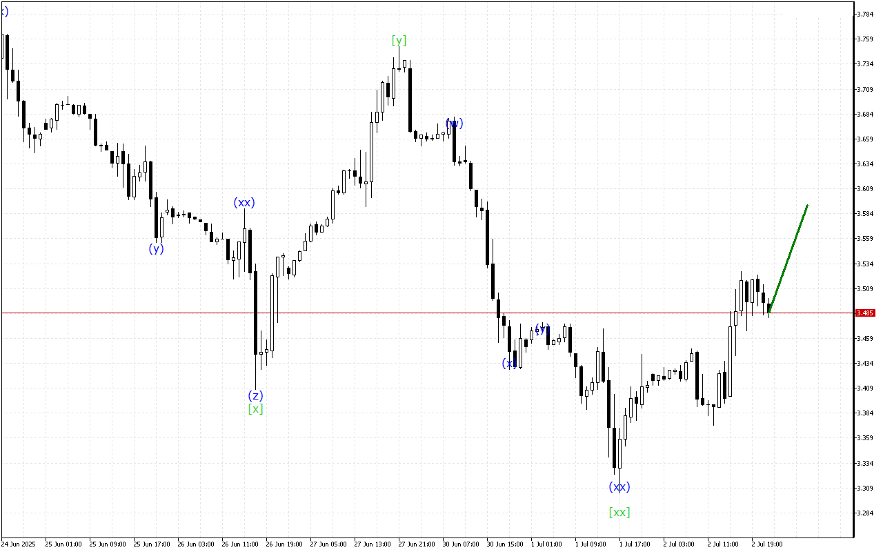 USDCHF орто мөөнөттүү кыймыл вектору Triple Three толкун структурасынын пайда болушун көрсөтөт. Азыр [xx] толкунунун пайда болушу аяктады жана [z] толкундун ичинде өйдө карай кыймылдын башталышы күтүлүүдө.