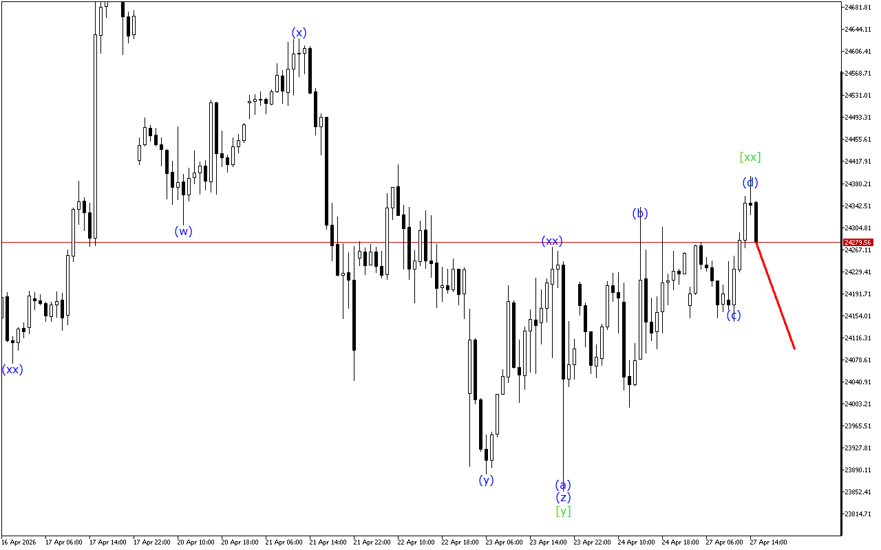 더 작은 시간 척도에 따르면, 시장은 ABC 지그재그 내에서 움직입니다. 현재 가격은 파동(c)의 형성을 완료하고 있으며 가격 움직임은 새로운 파동 형성으로 이동할 수 있습니다.