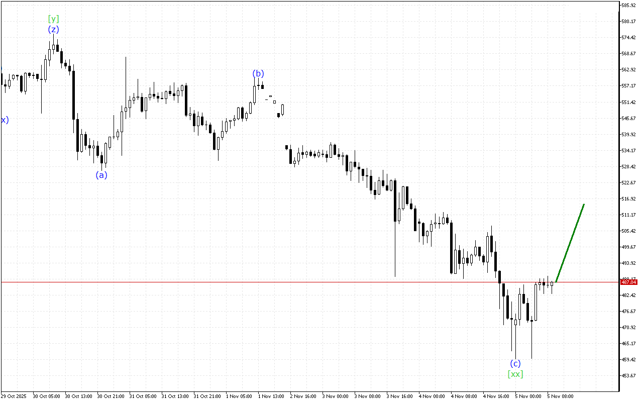 DAX 40 продолжает движение в рамках волновой структуры “Тройная тройка”. Сейчас на графике, судя по всему, завершилось формирование волны [хх] и мы можем ожидать развития восходящего движения с волной [z].