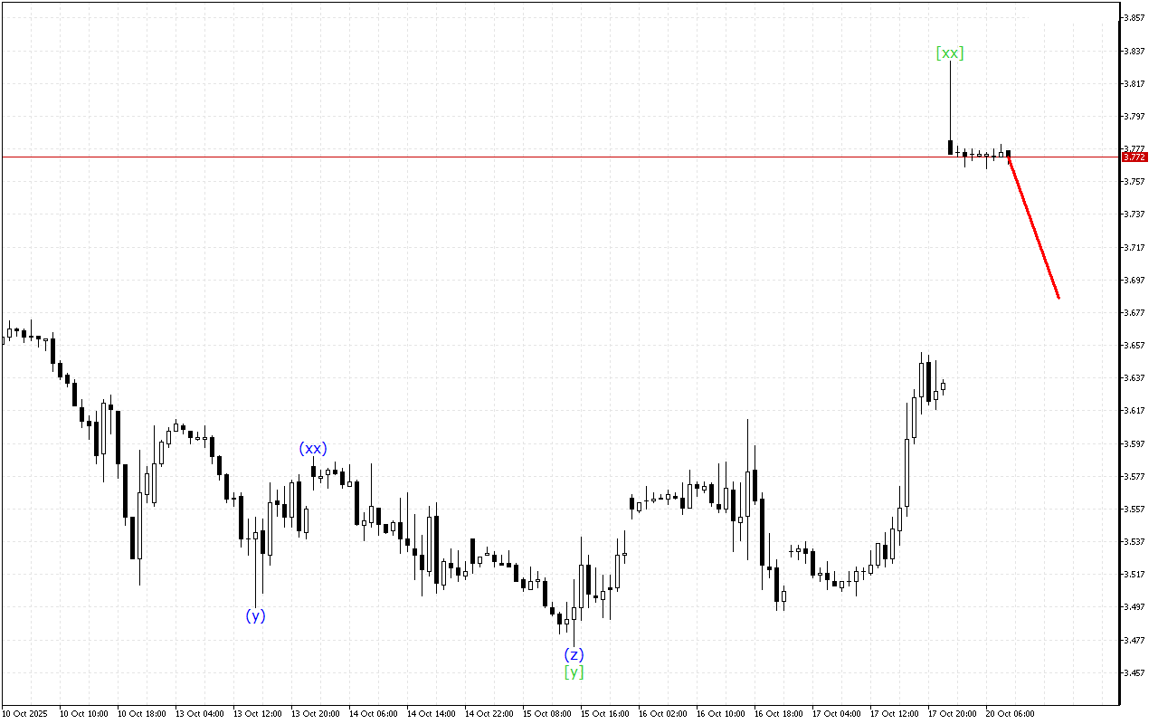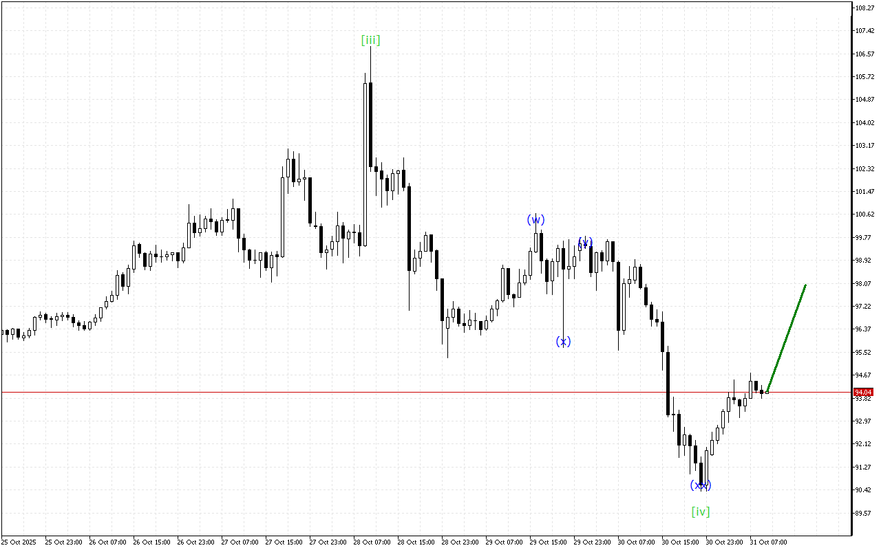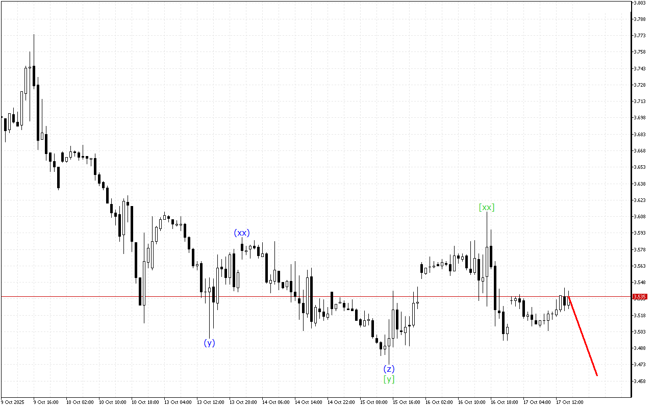 Волны меньшего временного интервала формируют тройную тройку. Цена находится в настоящее время в волне (z). После завершения этой волны можно ожидать начала более направленного движения цены.