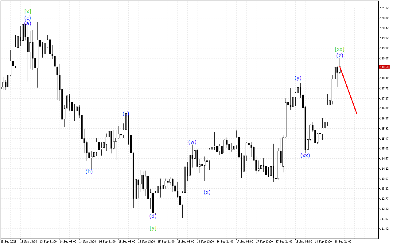 Текущая динамика движения указывает на формирование тройной тройки. На данный момент сформирована волна [xx], после чего ожидается начало развитие нисходящей волны [z].