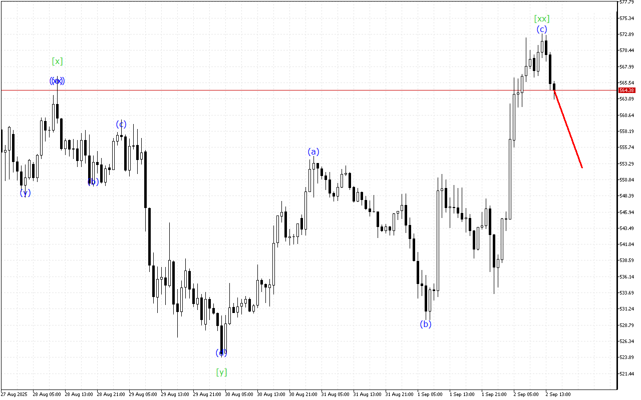 Среднесрочное движение указывает на развитие волновой структуры тройной тройки. В настоящее время сформирована волна [xx], после которой цена должна возобновить движение вниз.