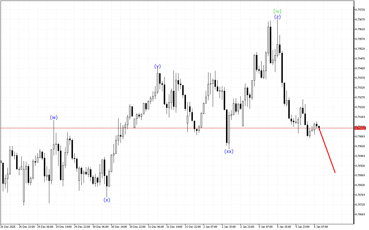Волны более низкого порядка указывают на формирование нисходящего зигзага ABC. Вероятнее всего, волна (c) уже завершена, поэтому мы можем ожидать формирования новой волновой структуры.
