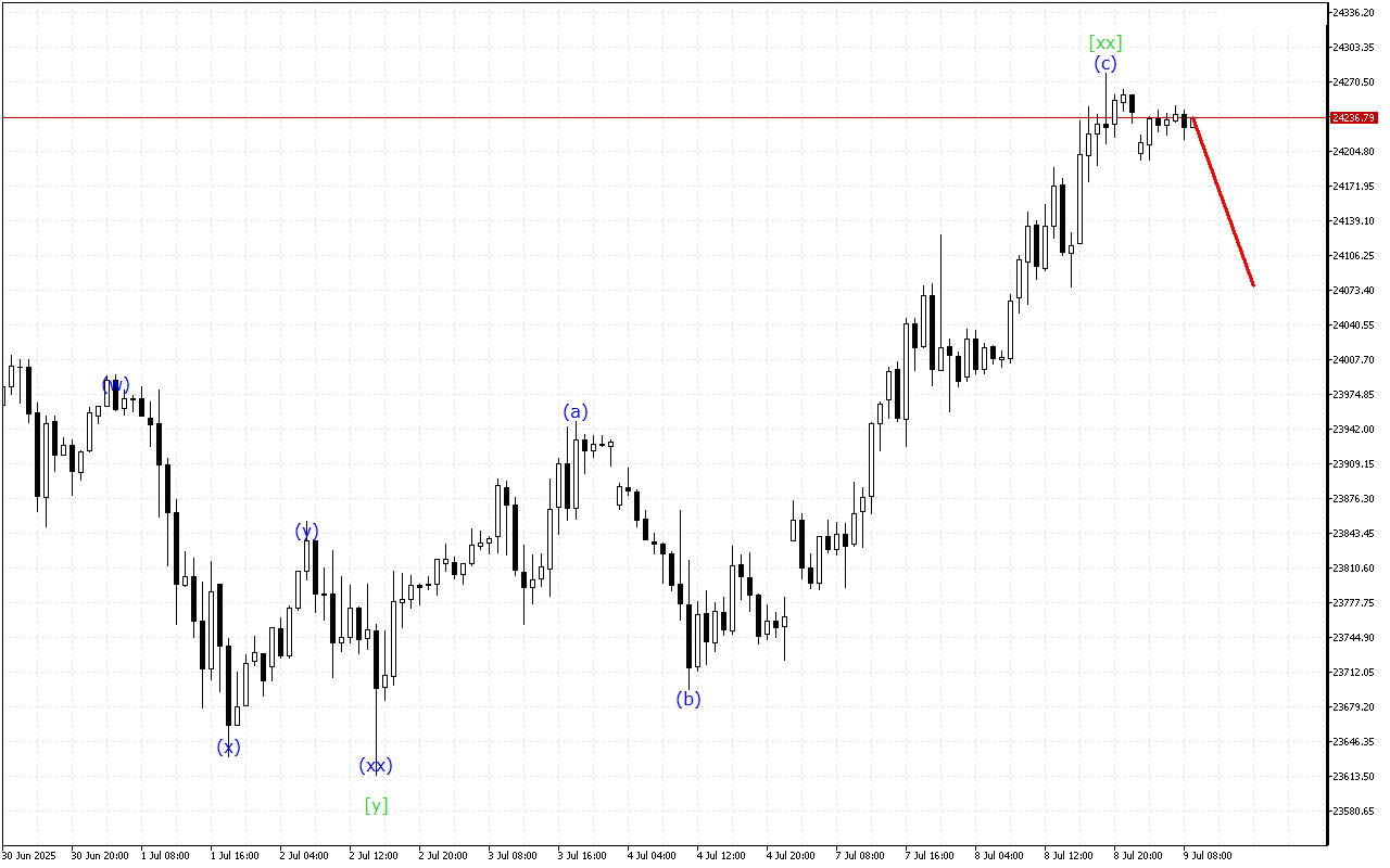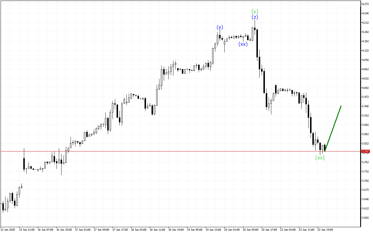 Natural Gas продолжает движение в рамках волновой структуры “Тройная тройка”. Сейчас на графике, судя по всему, завершилось формирование волны [хх] и мы можем ожидать развития восходящего движения с волной [z].
