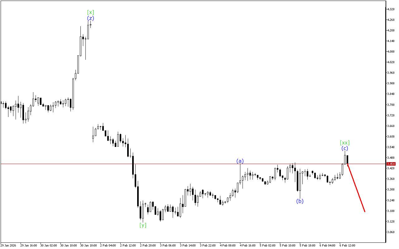 USDCHF продолжает движение в рамках волновой структуры “Тройная тройка”. Сейчас на графике, судя по всему, завершилось формирование волны [хх] и мы можем ожидать развития восходящего движения с волной [z].