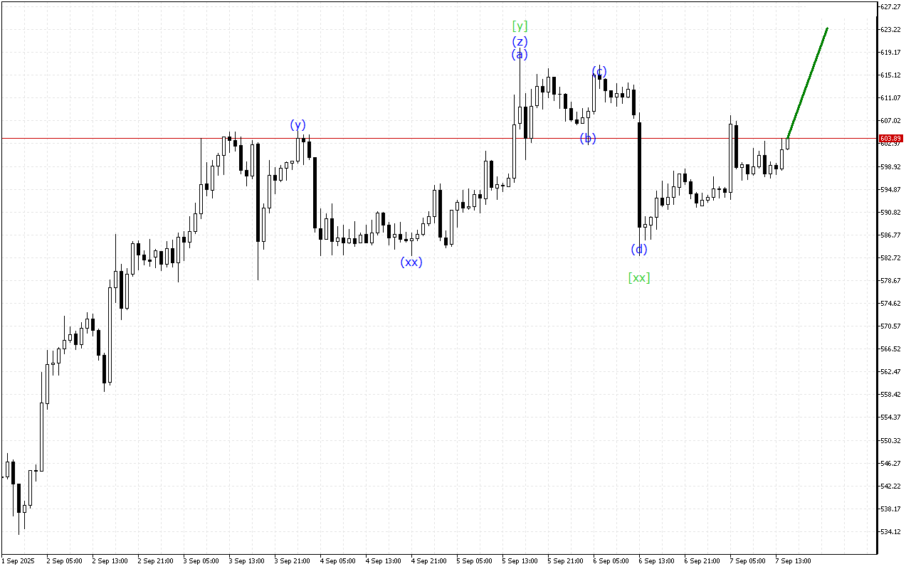 USDCHF продолжает движение в рамках волновой структуры “Тройная тройка”. Сейчас на графике, судя по всему, завершилось формирование волны [хх] и мы можем ожидать развития восходящего движения с волной [z].