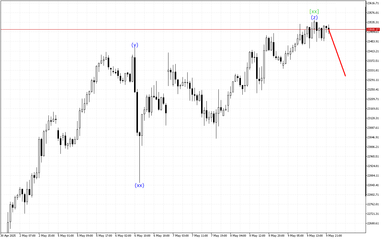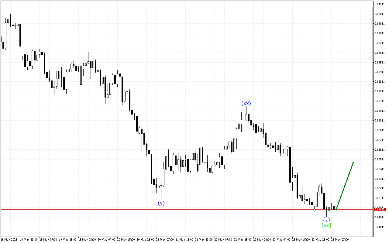 В контексте волновой структуры более низкого уровня отчетливо видим формирование зигзага ABC. Как только волна (c) будет полностью сформирована мы можем увидеть возобновление трендового движения.