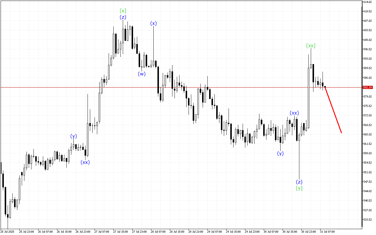 มีการพัฒนาโครงสร้างคลื่นสามลูกในช่วงเวลาที่สูงขึ้น ปัจจุบัน คลื่น [xx] ได้ก่อตัวขึ้นแล้ว หลังจากนั้น ราคาควรจะกลับมาเคลื่อนไหวขาลงอีกครั้ง