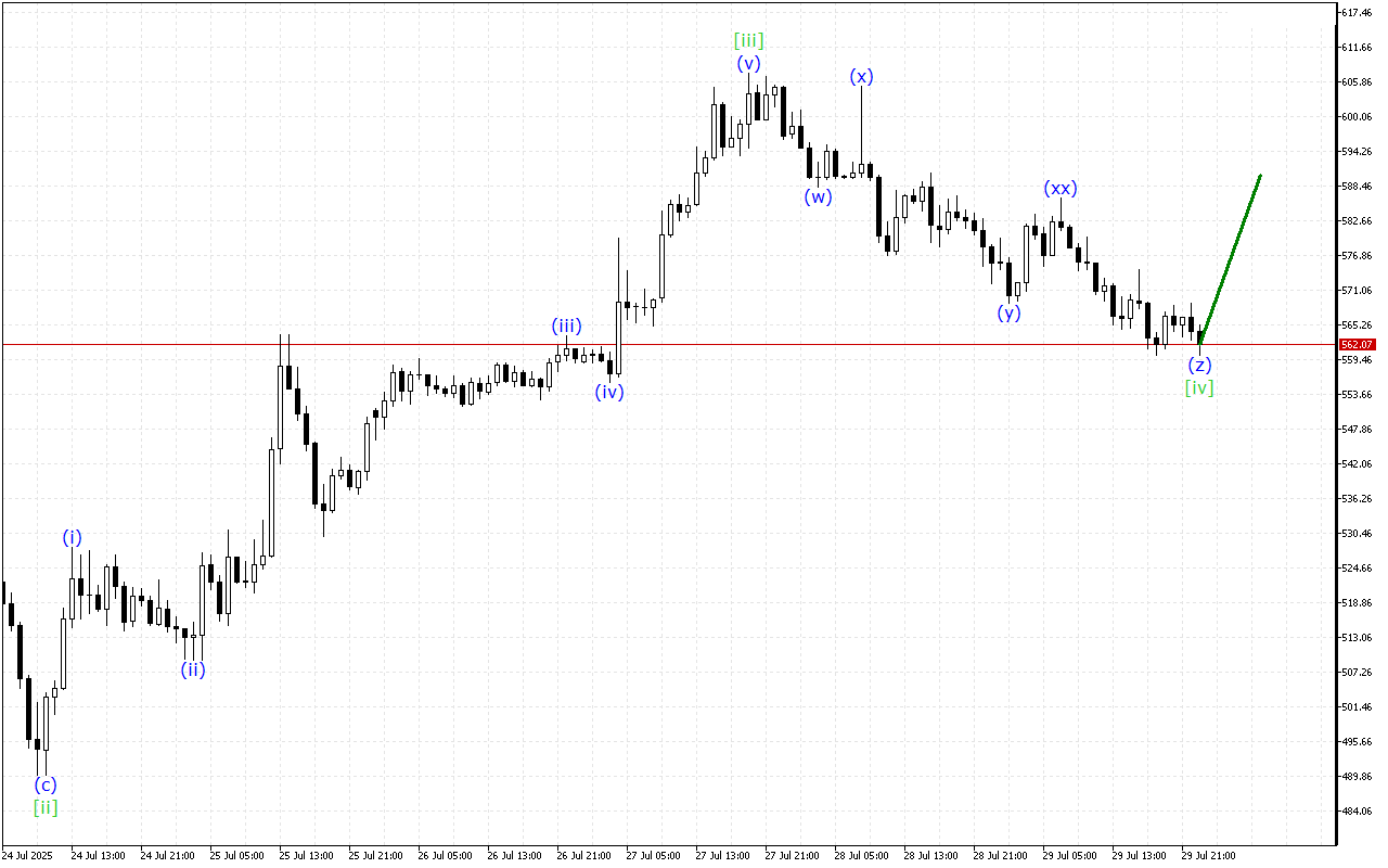 На більш високому інтервалі продовжує формуватися корекційна хвиля [iv]. Після його завершення ринок знову піде вгору. У рамках цього руху ми повинні побачити формування хвилі [v] з оновленням локального максимуму.