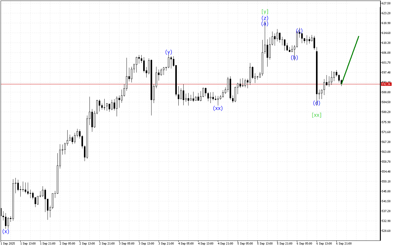 За меншим часовим масштабом ринок рухається в межах зигзага ABC. Зараз ціна, ймовірно, завершує формування хвилі (c), і рух ціни може перейти до формування нової хвилі.