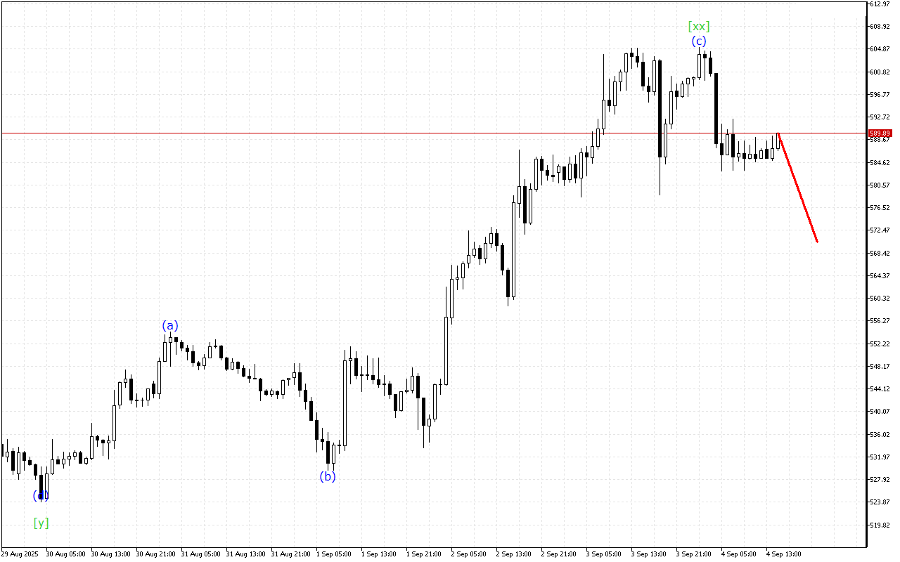 Існує розвиток потрійної трихвильової структури на більш високому таймфрейме. Наразі сформована хвиля [xx]. Після цього ціна повинна відновити рух вниз.