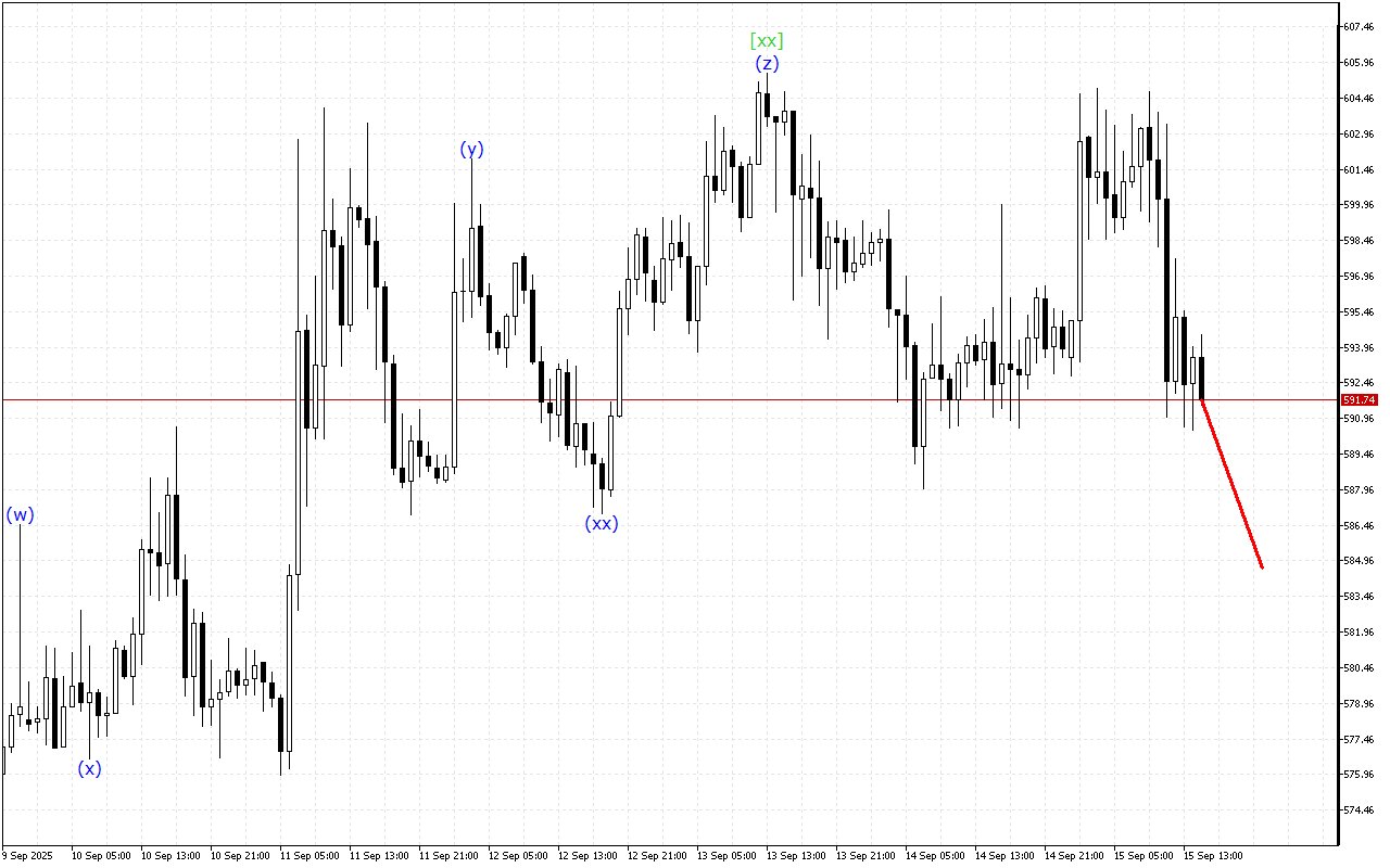 Існує розвиток потрійної трихвильової структури на більш високому таймфрейме. Наразі сформована хвиля [xx]. Після цього ціна повинна відновити рух вниз.