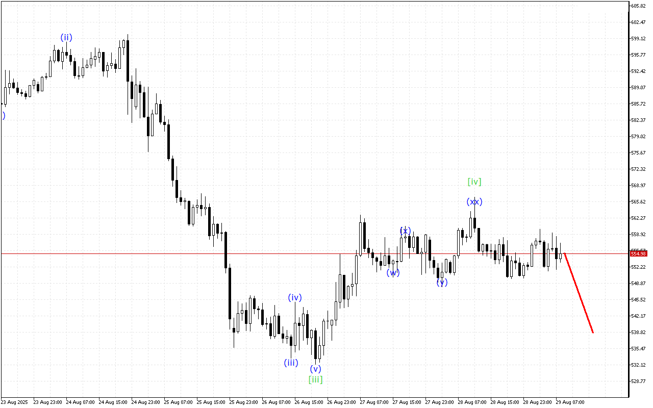 Аналіз хвильової структури вищого ступеня показує спадаючий клин. У рамках цієї п’ятихвильової формації завершується формування хвилі [iv] і очікується відновлення низхідного руху в межах хвилі [v].