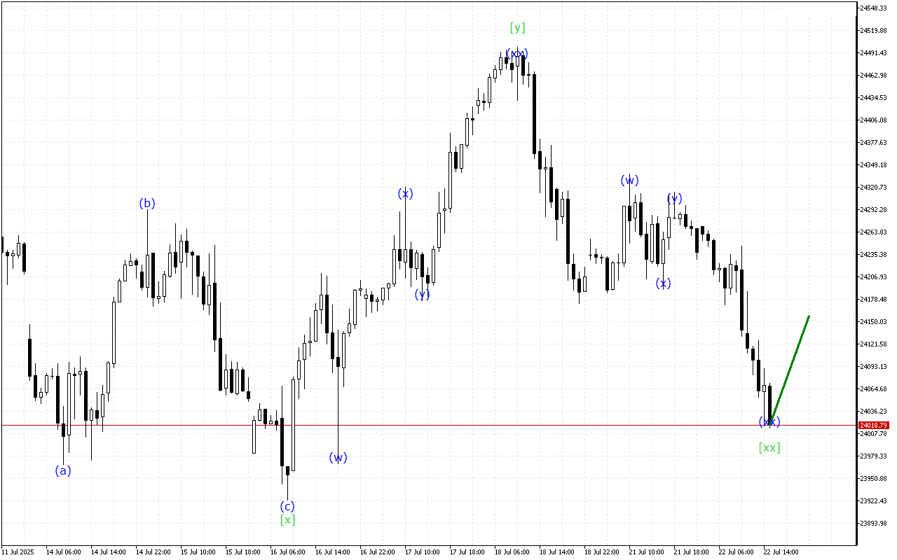 Середньостроковий вектор руху DAX 40 вказує на формування структури потрійних трьох хвиль. Зараз завершено формування хвилі [xx] і очікується початок висхідного руху в межах хвилі [z].