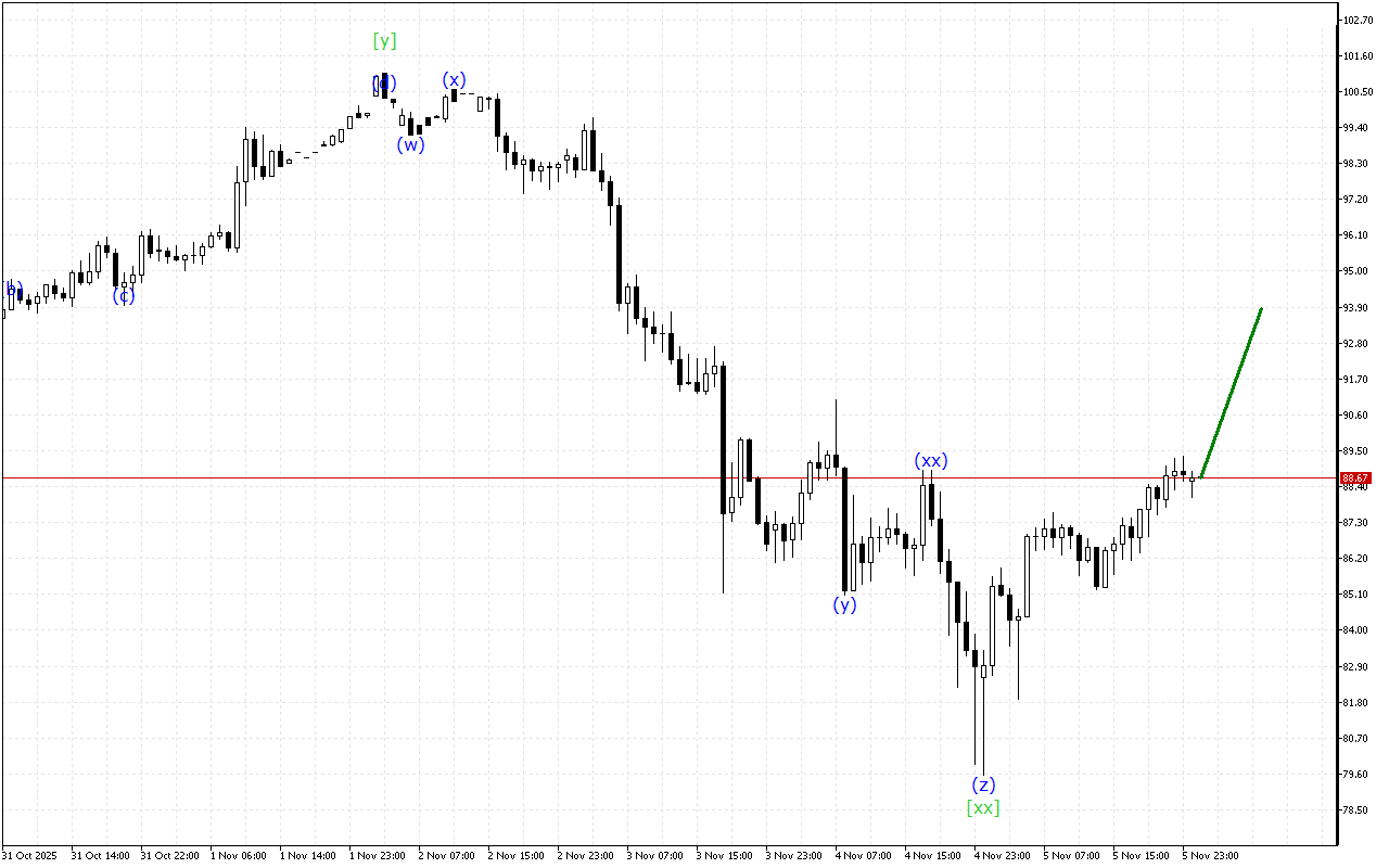 Хвилі нижнього таймфрейму утворюють потрійну трійку. Зараз ціна знаходиться у хвилі (z). Коли ця хвиля завершиться, очікується більш спрямований рух ціни.