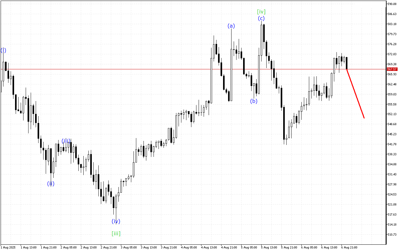 За меншим часовим масштабом ринок рухається в межах зигзага ABC. Зараз ціна, ймовірно, завершує формування хвилі (c), і рух ціни може перейти до формування нової хвилі.