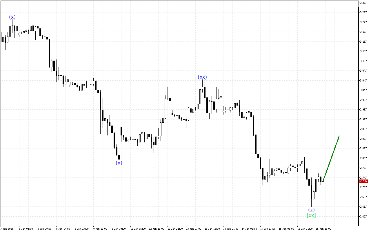 Середньостроковий вектор руху Natural Gas вказує на формування структури потрійних трьох хвиль. Зараз завершено формування хвилі [xx] і очікується початок висхідного руху в межах хвилі [z].