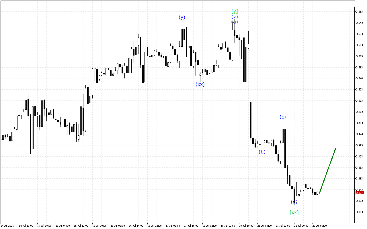 Хвильова структура вищого ступеня є корекційною областю. Зараз видно формування кінцевої хвилі [y]. Після його завершення можна визначити подальший напрямок руху на ринку або буде видно розвиток п’ятихвильової структури.