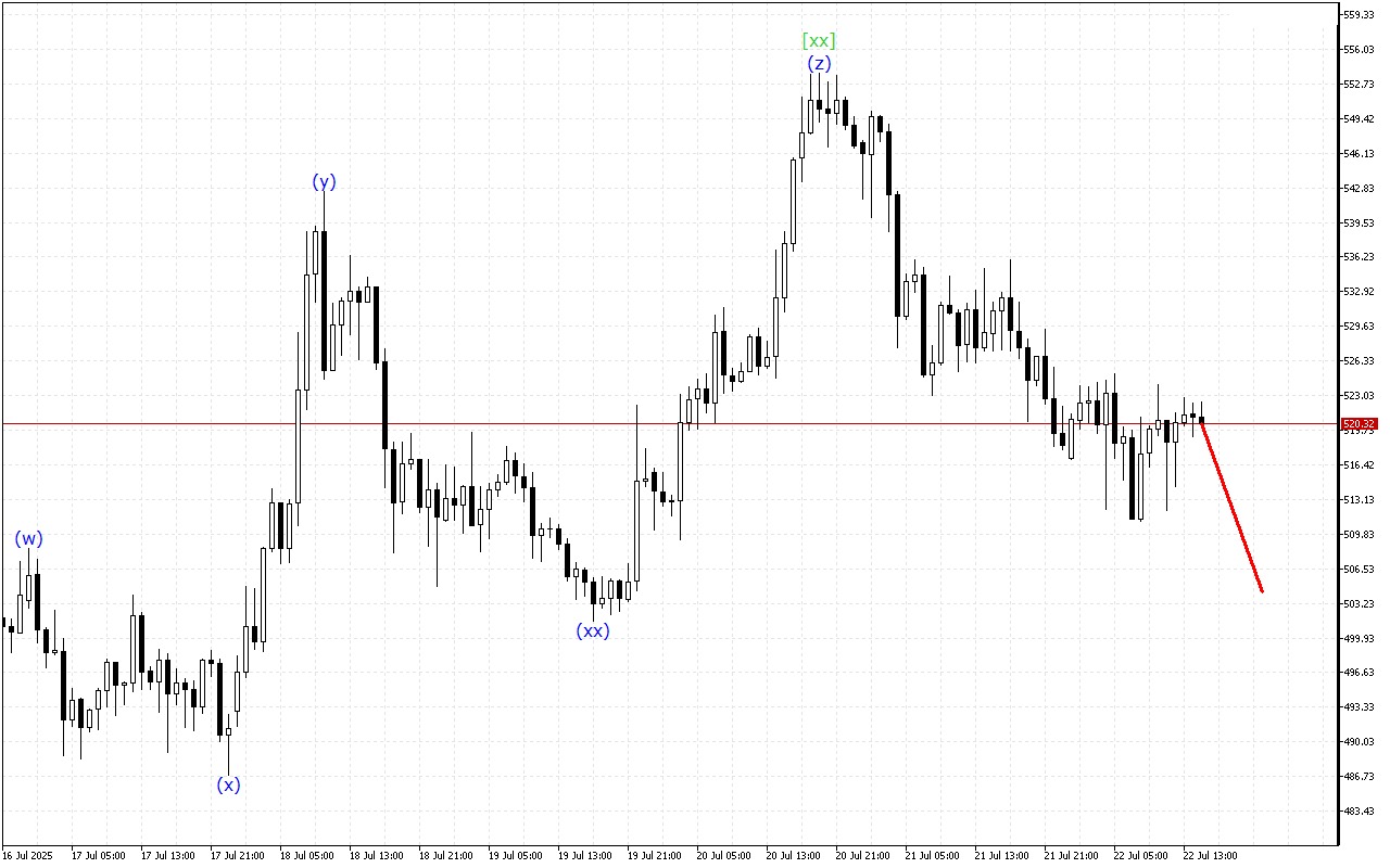 Хвилі нижчого ступеня вказують на утворення низхідного зигзага ABC. Хвиля (c) повинна бути вже завершена, тому можна очікувати формування нової хвильової структури.