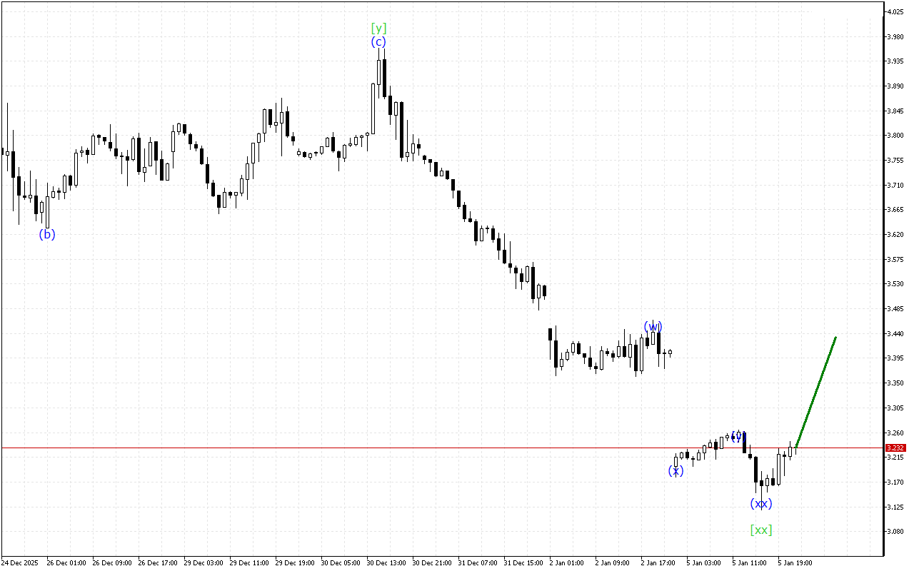 Сучасна динаміка руху свідчить про формування потрійної трійки. На даний момент сформована хвиля [xx]. Після його формування очікується розвиток спадної хвилі [z].