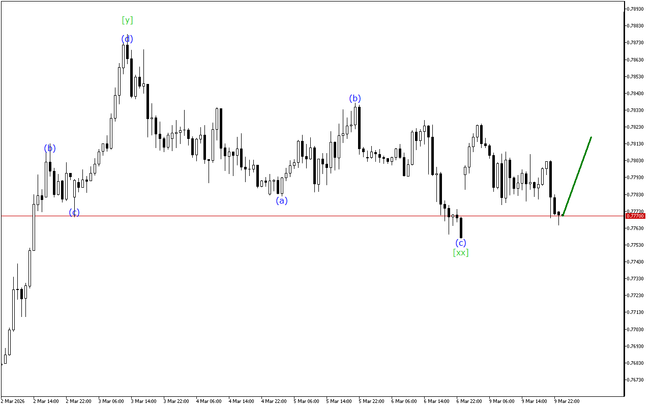 더 작은 시간 척도에 따르면, 시장은 ABC 지그재그 내에서 움직입니다. 현재 가격은 파동(c)의 형성을 완료하고 있으며 가격 움직임은 새로운 파동 형성으로 이동할 수 있습니다.