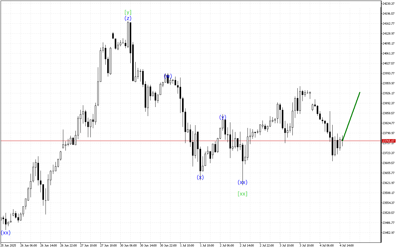 하위 차수 파동 구조의 맥락에서 ABC 지그재그의 형성이 명확하게 보입니다. 파동(c)이 완전히 형성되면 추세 움직임이 재개되는 것을 관찰할 수 있습니다.