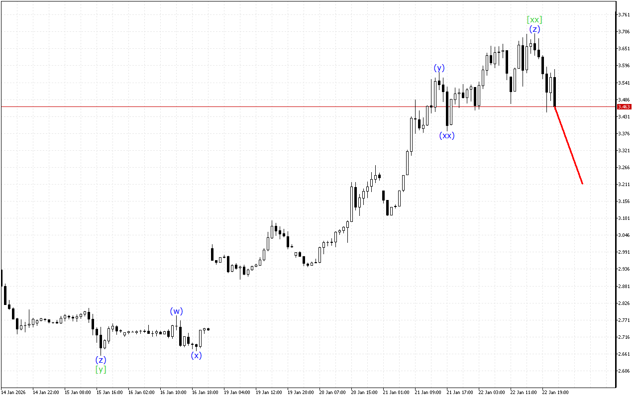 상위 파동 구조의 분석은 하강 쐐기 모양을 보여줍니다. 이 5파 형성 내에서 파동 [iv]의 형성이 완료되고 파동 [v] 내에서 하향 운동이 재개될 것으로 예상됩니다.