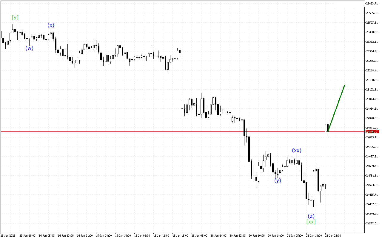 더 높은 시간 프레임에서 트리플 쓰리 웨이브 구조가 개발되고 있습니다. 현재 [xx] 웨이브가 형성되었습니다. 이후 가격은 하락 추세를 재개해야 합니다.