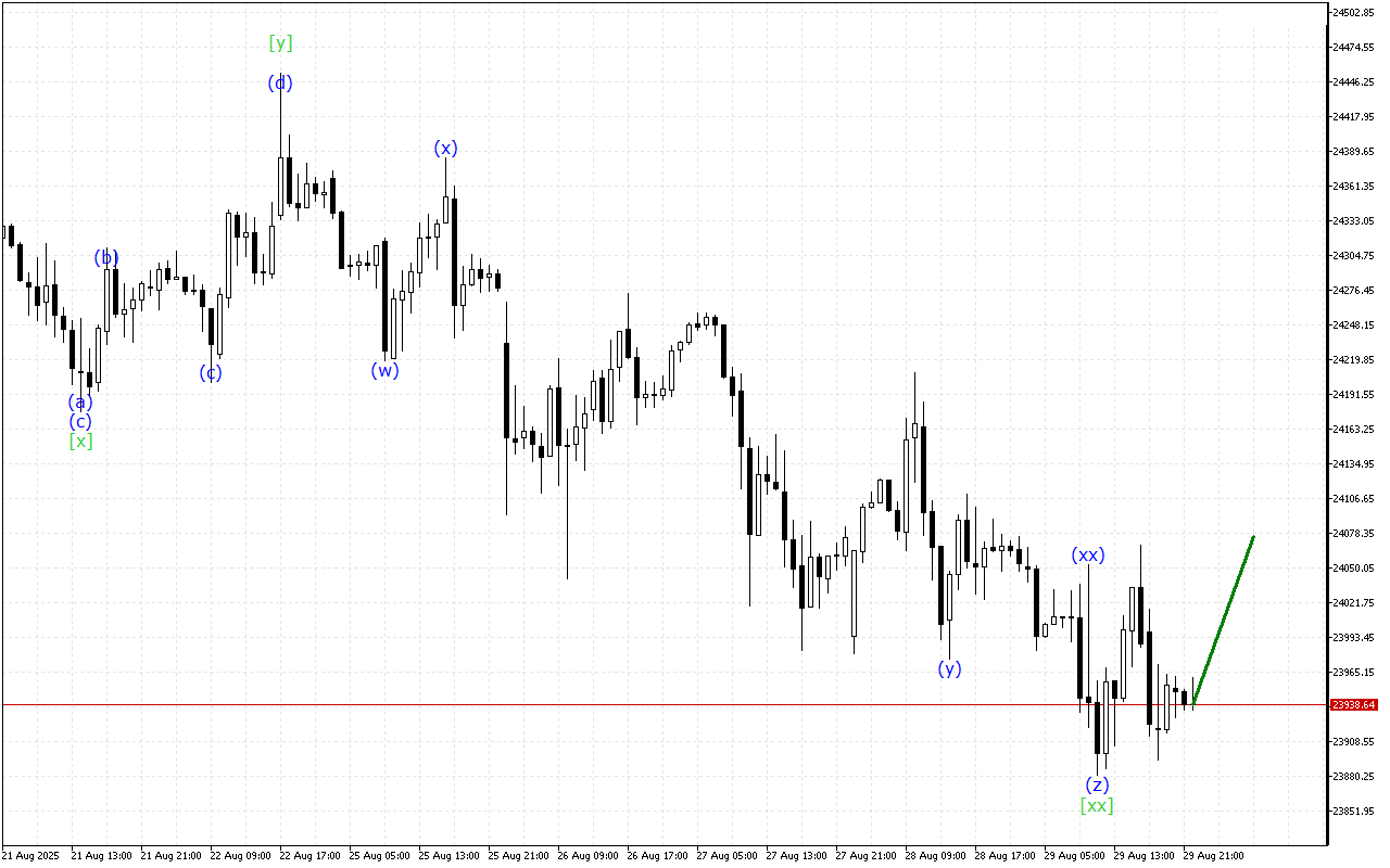 DAX 40 Triple Three to’lqin tuzilishi ichida harakat qilishda davom etmoqda. Endi, aftidan, diagrammada to’lqinning [xx] shakllanishi yakunlandi va to’lqin [z] bilan yuqoriga qarab harakatning rivojlanishini kutish mumkin.